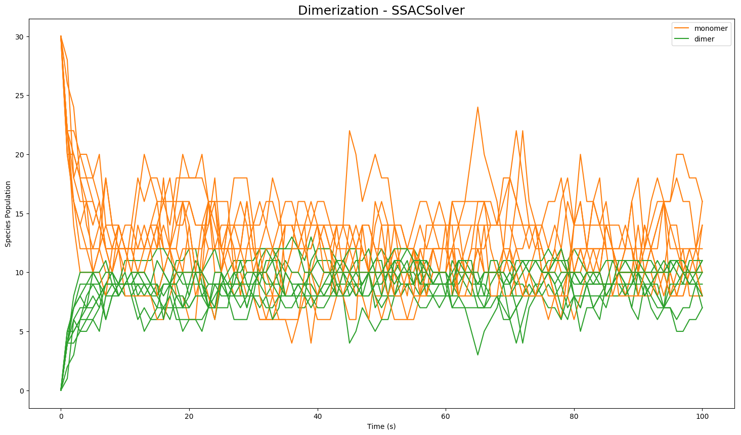 results = model.run(number_of_trajectories=10)The results are then stored in a class Results object for single trajectory or for multiple trajectories. Results can be plotted with matplotlib using plot() or in plotly (offline) using plotplotly(). For additional plotting options such as plotting from a selection of species, or statistical plotting, please see the documentation.: