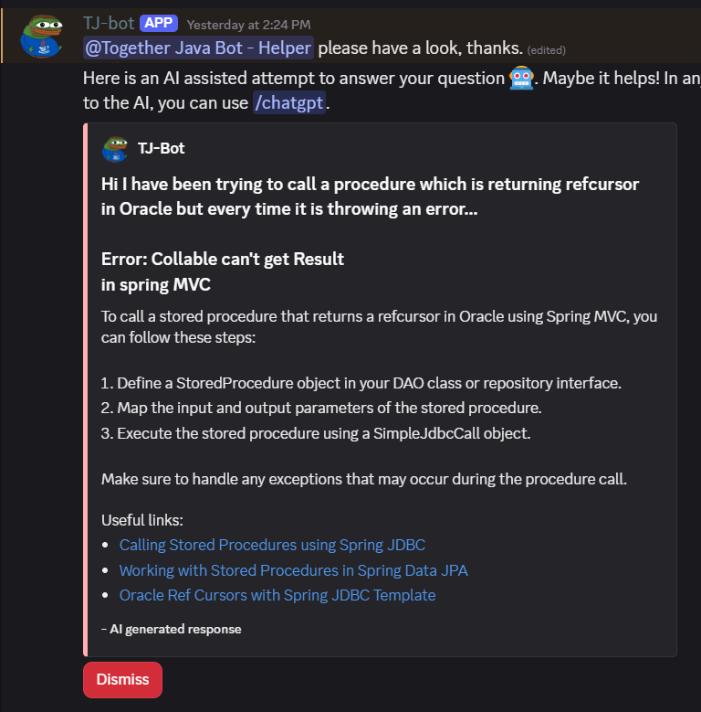 ChatGpt attempts to answer each question posted in #question and it provides "useful links", which is great.