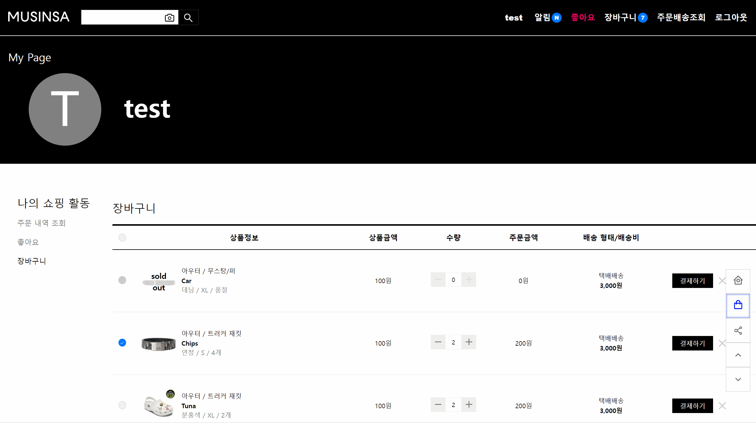 - 장바구니 기능 구현(삭제, 결제, 수량변경 등)