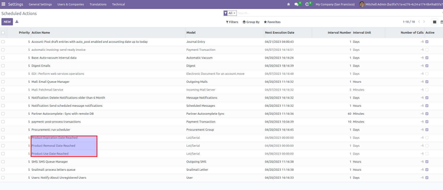 - To configure activities crons, go to Settings > Technical > Scheduled Actions