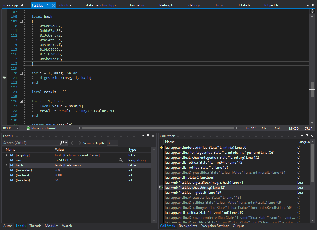 - Lua call stack frames in the Call Stack window