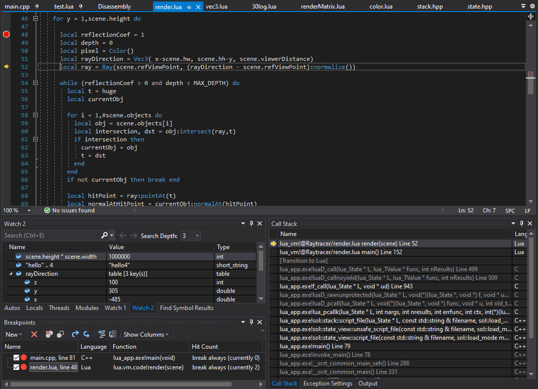 - Step Into from Lua into C++ doesn't work at the moment