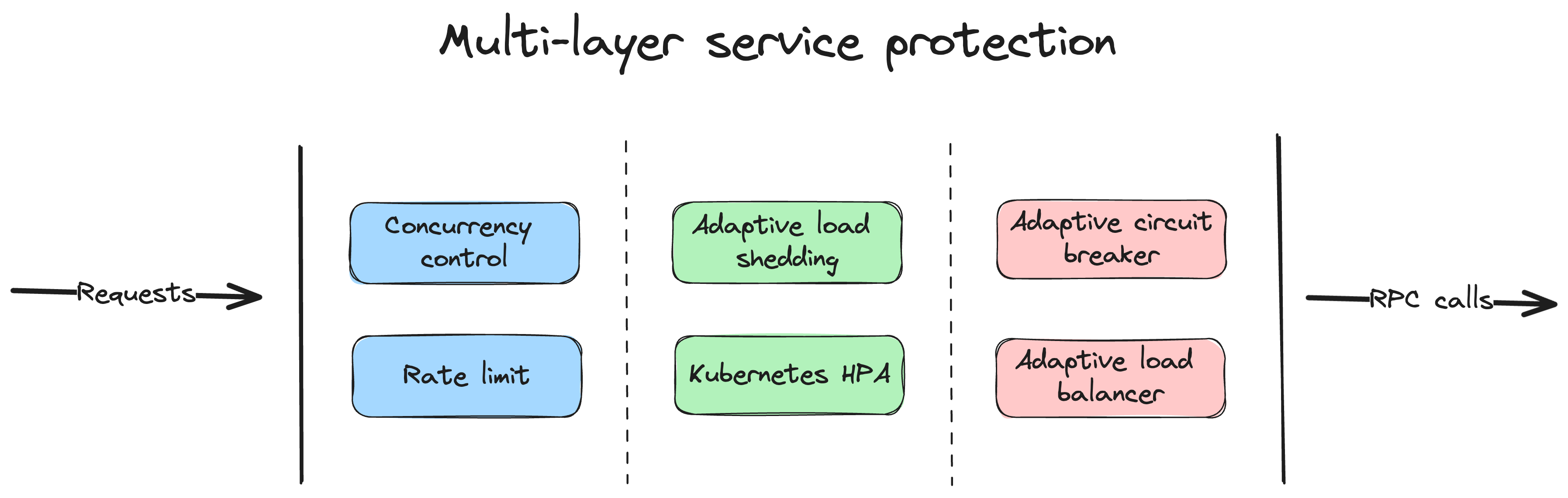 As below, go-zero protects the system with a couple of layers and mechanisms: