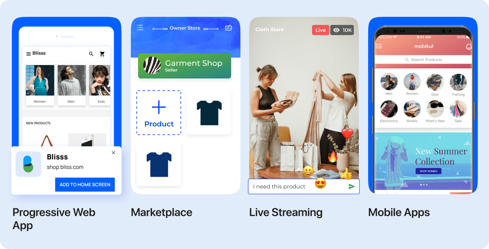 With Bagisto, you can easily create use cases for various commerce needs like Marketplaces, PWA, Native Mobile Apps, Multi-Tenants systems, Blockchain and many more.