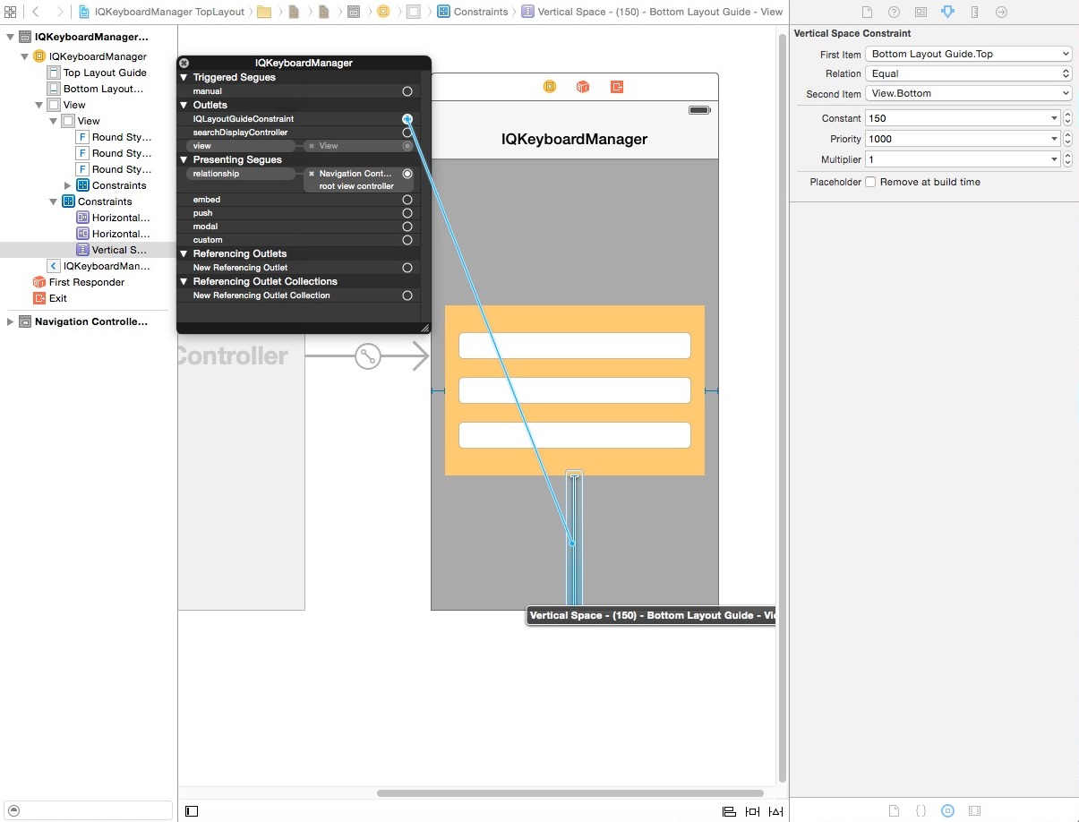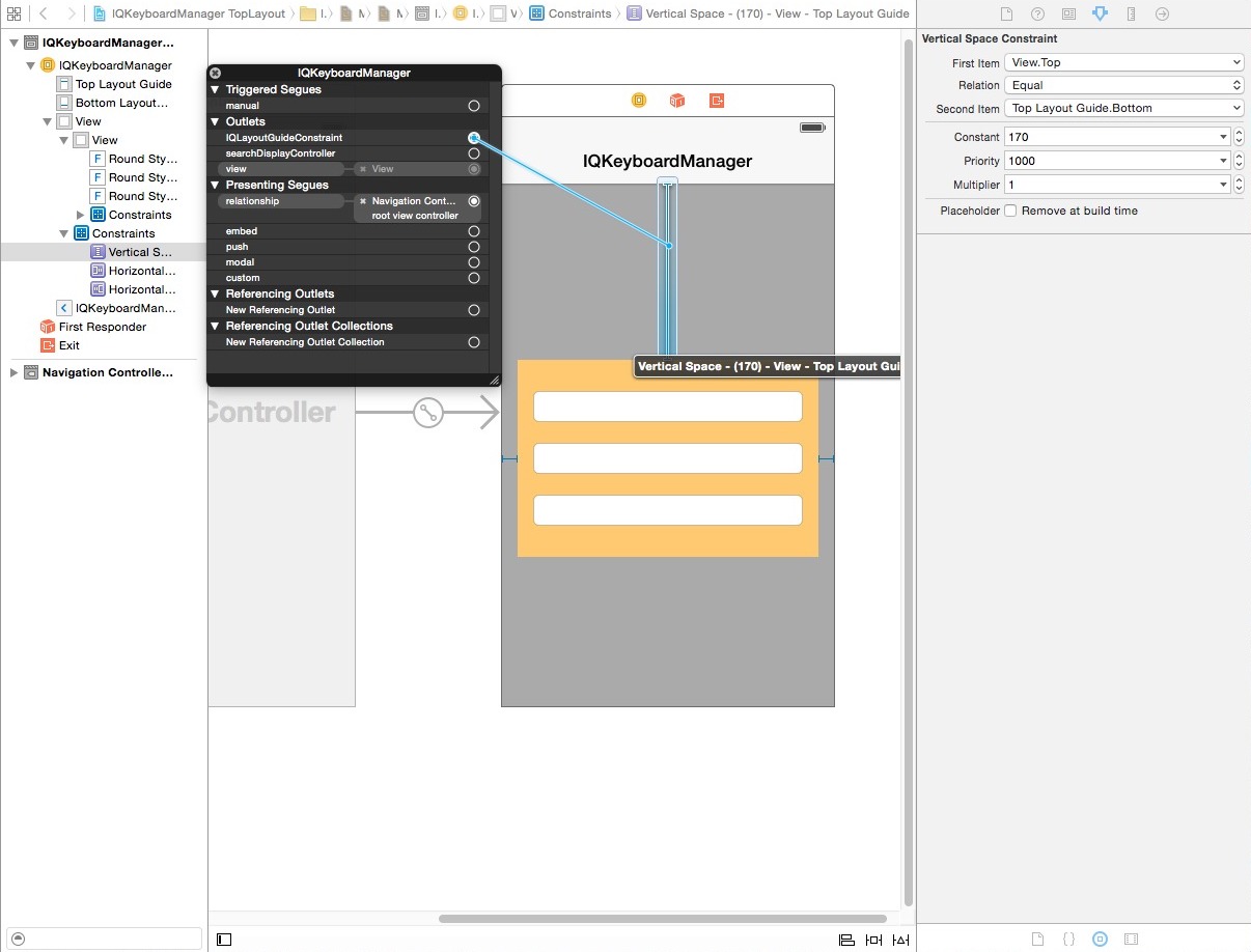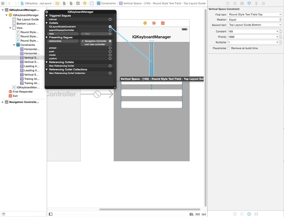 If your textFields are inside any UIView and your UIView is pinned with TopLayoutGuide/BotomLayoutGuide then also you can map TopLayoutGuide/BottomLayoutGuide constraint with IQLayoutGuideConstraint. here are the screenshots:-