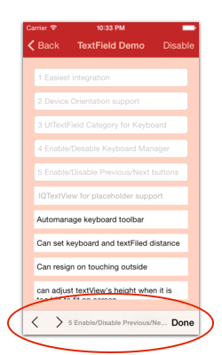 - If you need your own control over the previous/next/done button then you should use the UIView category methods to add toolbar over your textField. The UIView category methods are defined in