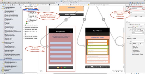 If you don't want to hide the default UINavigationBar of UINavigationController when keyboardManager slides up the view, then just change the UIView class to UIScrollView from the storyboard or xib.(#21, #24)