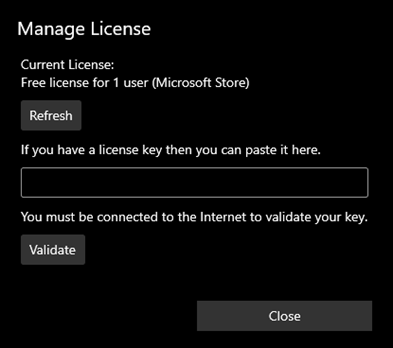 Input the License Key then click Validate and then Close.