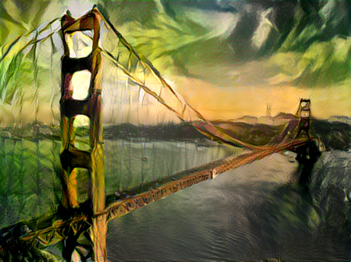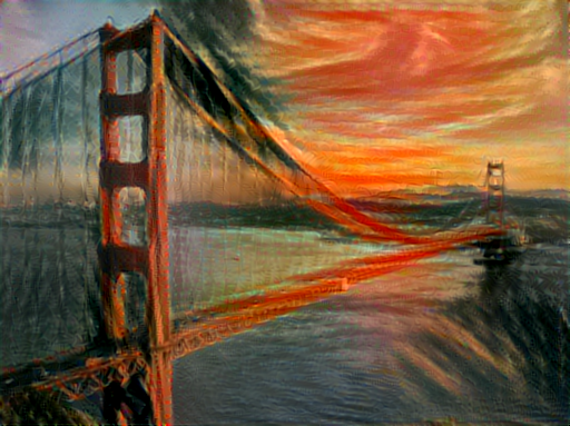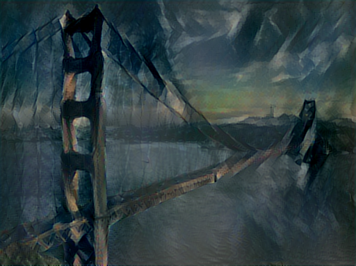 Here are the results of applying the style of various pieces of artwork to this photograph of the golden gate bridge: