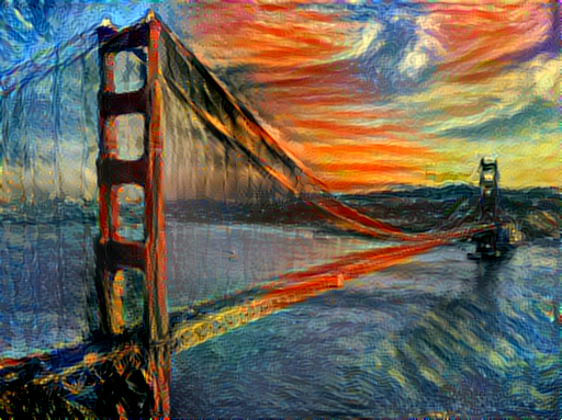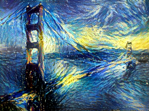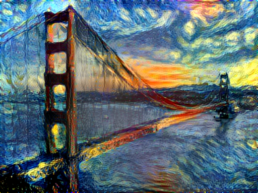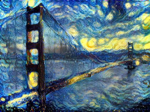 Below we see three examples of rendering the Golden Gate Bridge in the style of The Starry Night.