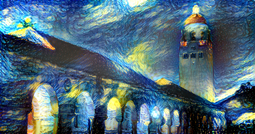 The paper presents an algorithm for combining the content of one image with the style of another image using convolutional neural networks. Here's an example that maps the artistic style of The Starry Night onto a night-time photograph of the Stanford campus: