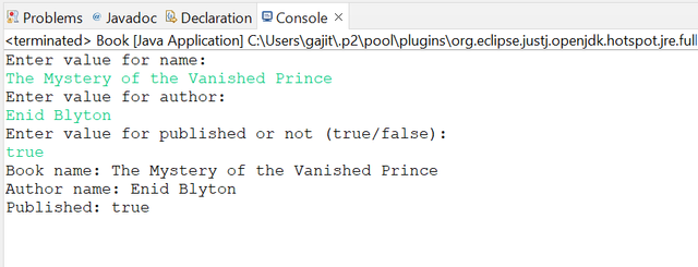 Here, we create a Book class, which asks the user for three inputs: book name, author name, publish status, and then prints those values sequentially to the console.