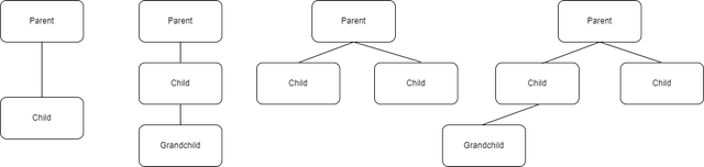 Single, multi-level/chained, hierarchical, and hybrid (mix of first 3) inheritance. Class can access properties of another class. First class is called parent-/base-/superclass, second is called child-/derived-/subclass. Implemented using extends keyword. Multiple inheritance not supported.