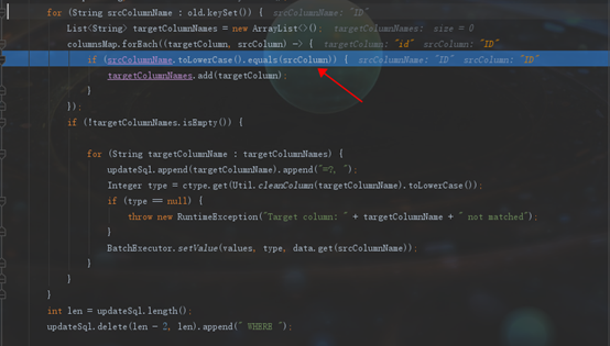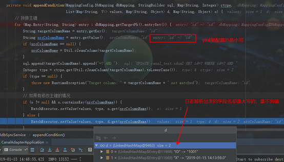 跟到RdbSyncService.appendCondition 方法发现是字段值没有正确匹配