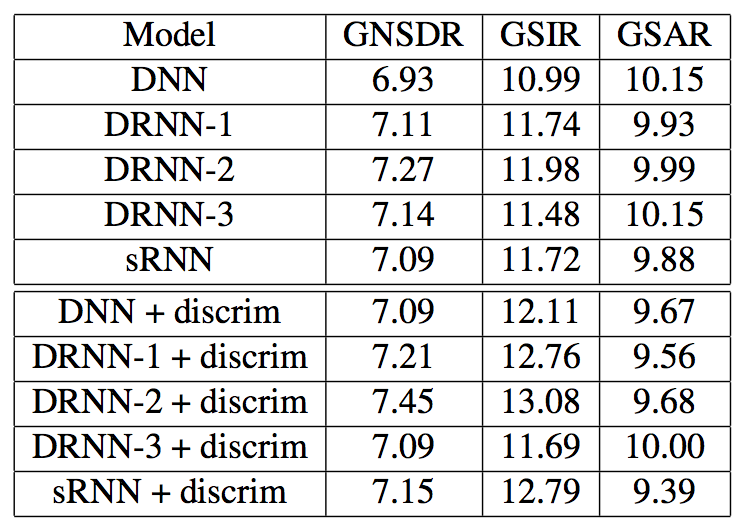 - The proposed neural network models achieve 2.30-2.48 dB GNSDR gain, 4.32-5.42 dB GSIR gain with similar GSAR performance, compared with conventional approaches. (quantum jump!!!)