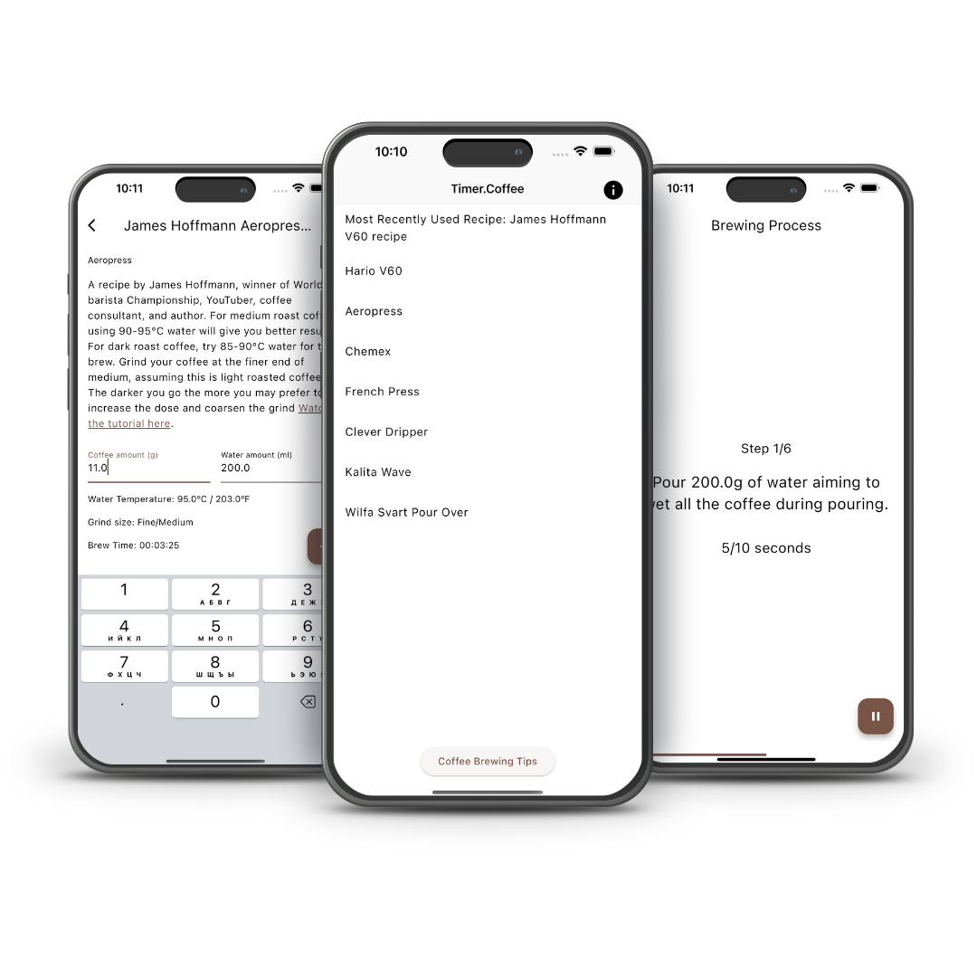 Escoffee.Coffee is a free and open source app which can help you to brew great coffee. Currently supported brewing techniques are: Hario V60, Aeropress, Chemex, French Press, Kalita Wave, Wilfa Svart Pour Over, Origami Dripper. The app features more than 30 recipes with more on the way.