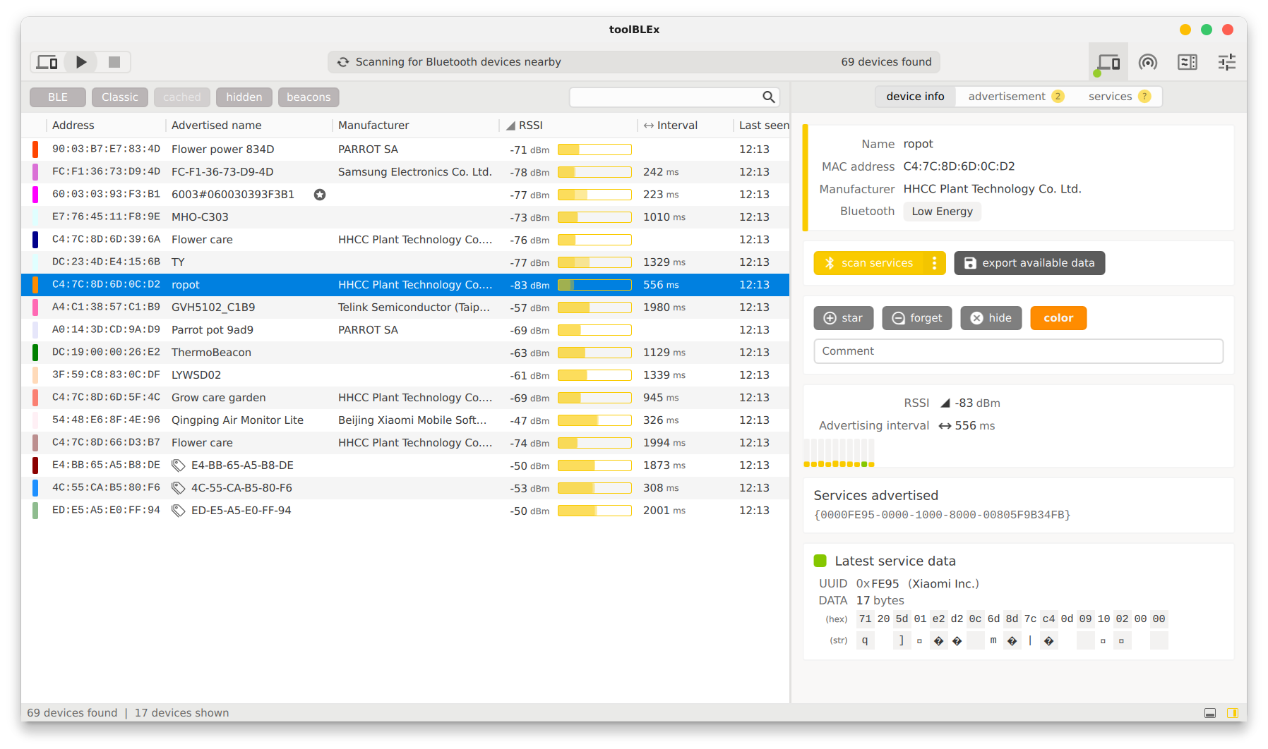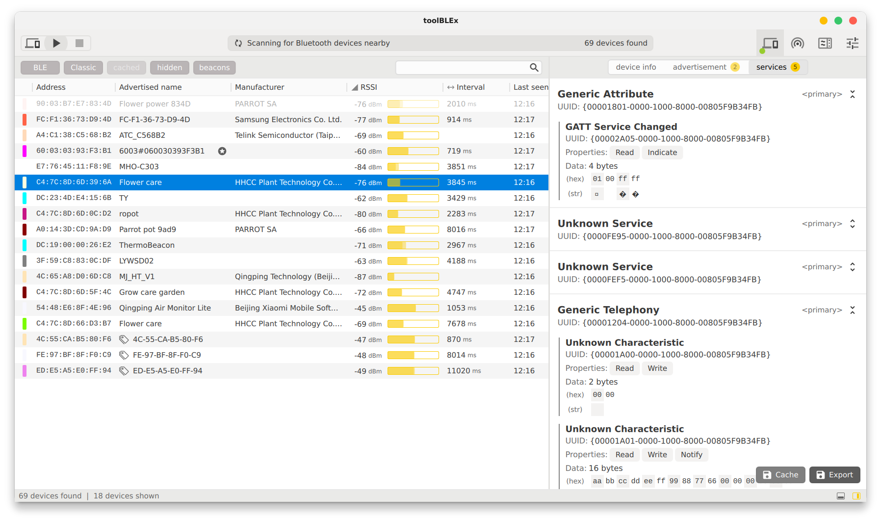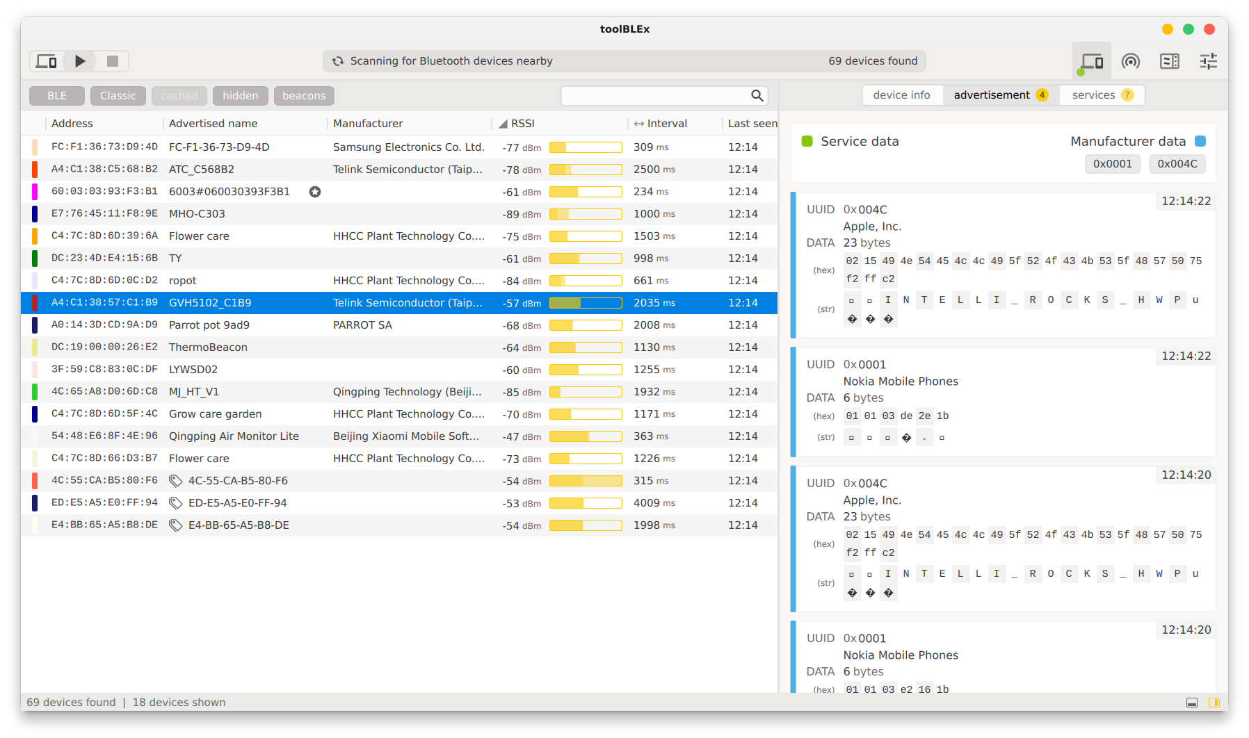 A Bluetooth Low Energy device scanner and analyzer.