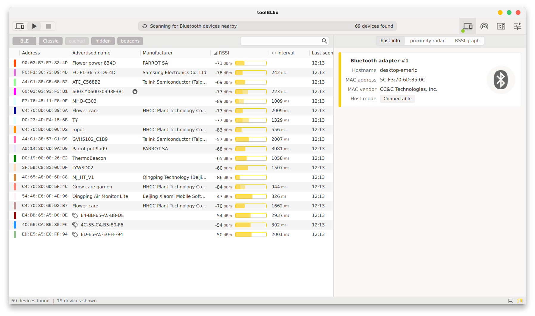 - RSSI graph / proximity graph (BLE and classic)
