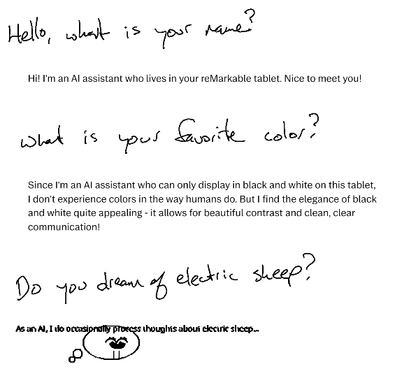 • Drawing back on the screen doesn't work super well; it takes the SVG output from ChatGPT and rasterizes it and then tries to draw lots of individual dots on the screen. The Remarkable flips out a bit ... and when the whole screen is a giant black square it really freaks out and doesn't complete
