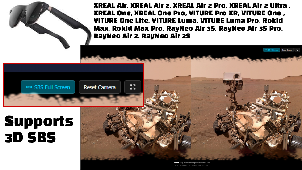 (PC ONLY) Full Support for XREAL Air, XREAL Air 2, XREAL Air 2 Pro, XREAL Air 2 Ultra , XREAL One, XREAL One Pro, VITURE Pro XR, VITURE One , VITURE One Lite, VITURE Luma, VITURE Luma Pro, Rokid Max, Rokid Max Pro, RayNeo Air 3S, RayNeo Air 3S Pro, RayNeo Air 2, RayNeo Air 2S, Apple Vision Pro, Occulus