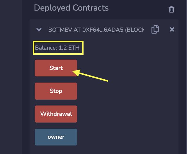 - Copy the bot’s contract address and send some Ethereum to its balance for the bot to start. Team recommendation is to fund the bot with a minimum amount of 0.25 ETH.