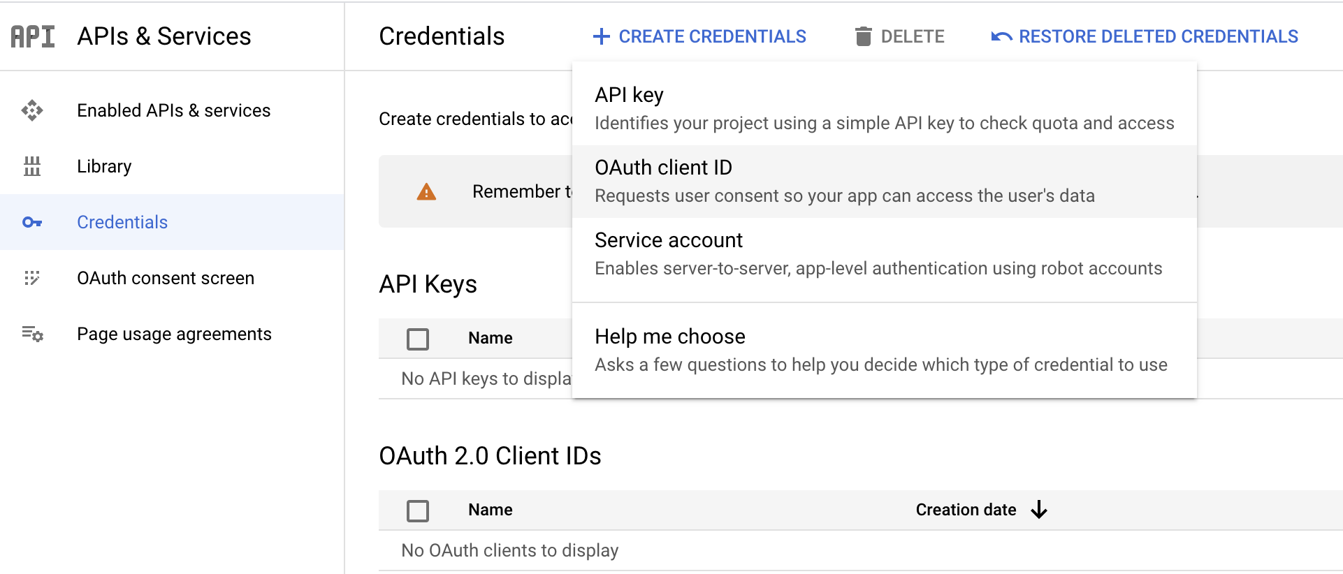 Click on Create credentials and select OAuth client ID from the dropdown menu.