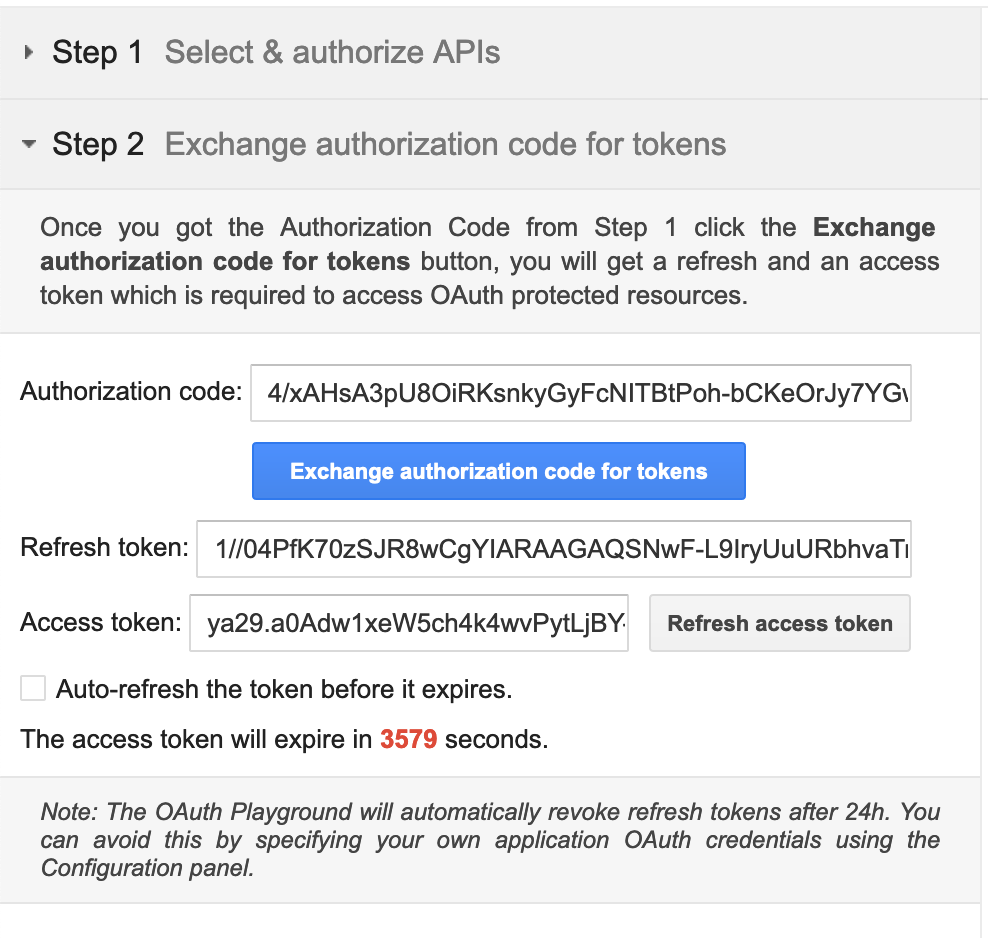 Note: It is recommended to use the OAuth 2.0 playground to obtain the tokens.