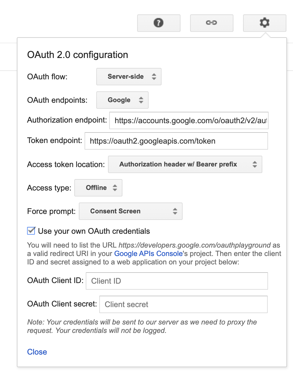 Configure the OAuth playground with the OAuth client ID and client secret.