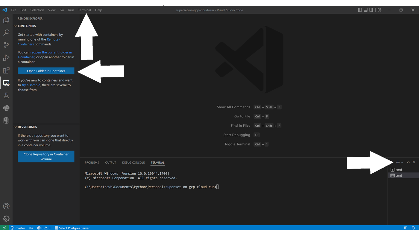 superset-on-gcp-cloud-run. This step can take 5-10 minutes while the dependencies download and the container is built. When the container is fully built the file tree should display in the left pane. - From the top VS Code menu choose 'Terminal' > 'New Terminal' to open a terminal pane.