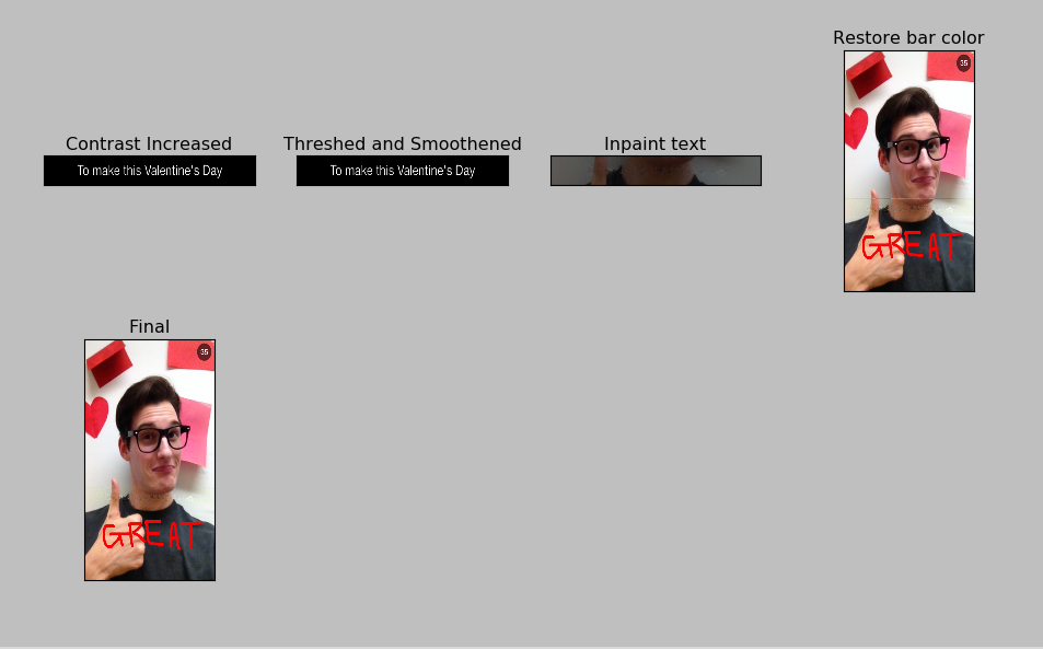 - This caption bar has Contrast Enhancement applied on it so that the text comes out upfront and should be easy to inpaint. We use the principle that every pixel can be transformed as X = aY + b where a and b are scalars and control the contrast and brightness. Have a look at the reference article on SO here.