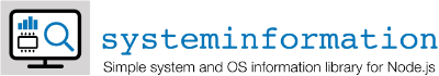 $ npm install systeminformation --saveAll functions (except version and time) are implemented as asynchronous functions. Here a small example how to use them: