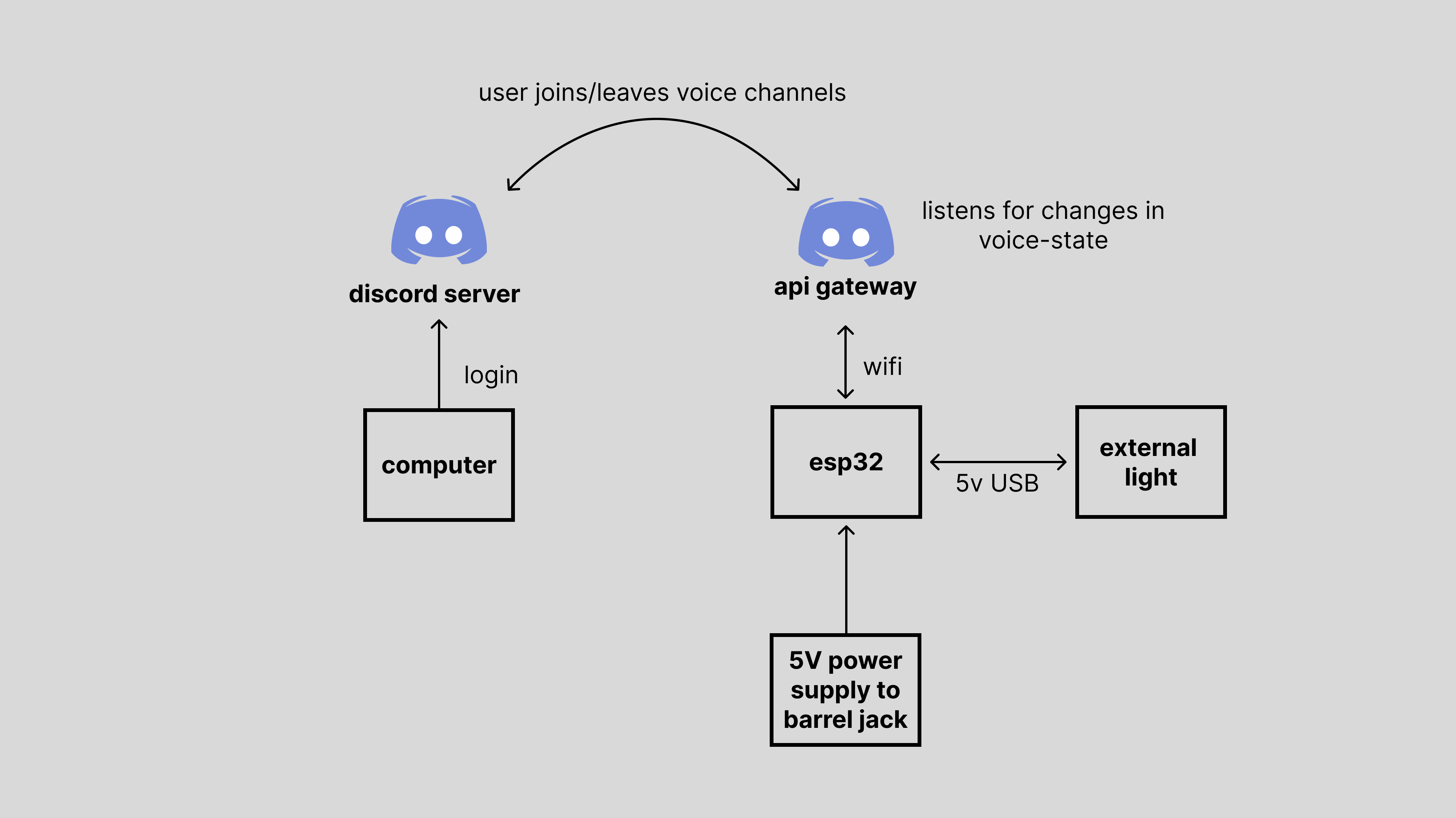 The bot first connects to wifi then attempts to create a socket connection to the discord gateway api to receive 'voice-state' commands from the desired user. After the connection is made, it only listens to discord events when the user joins/exits a channel.