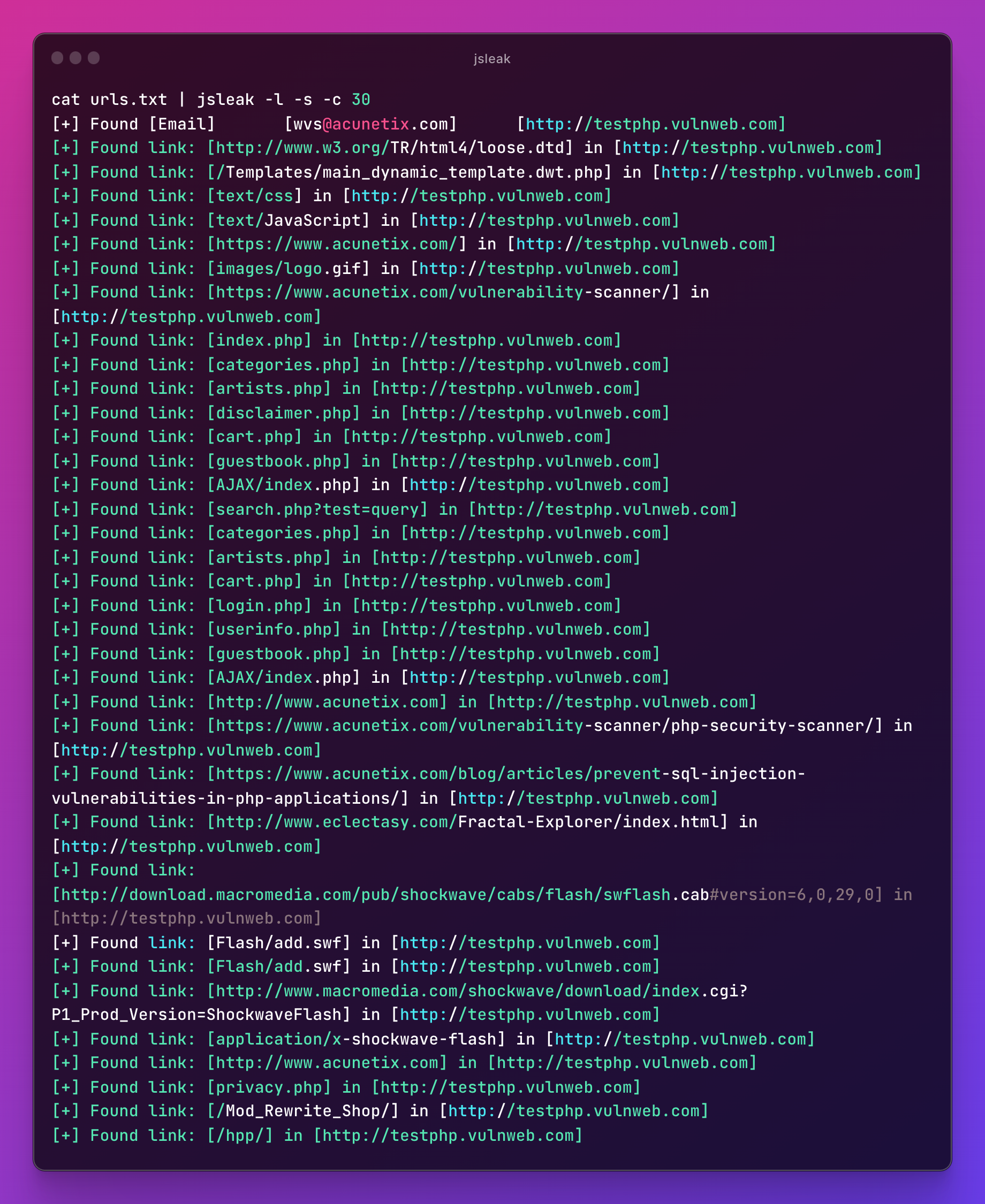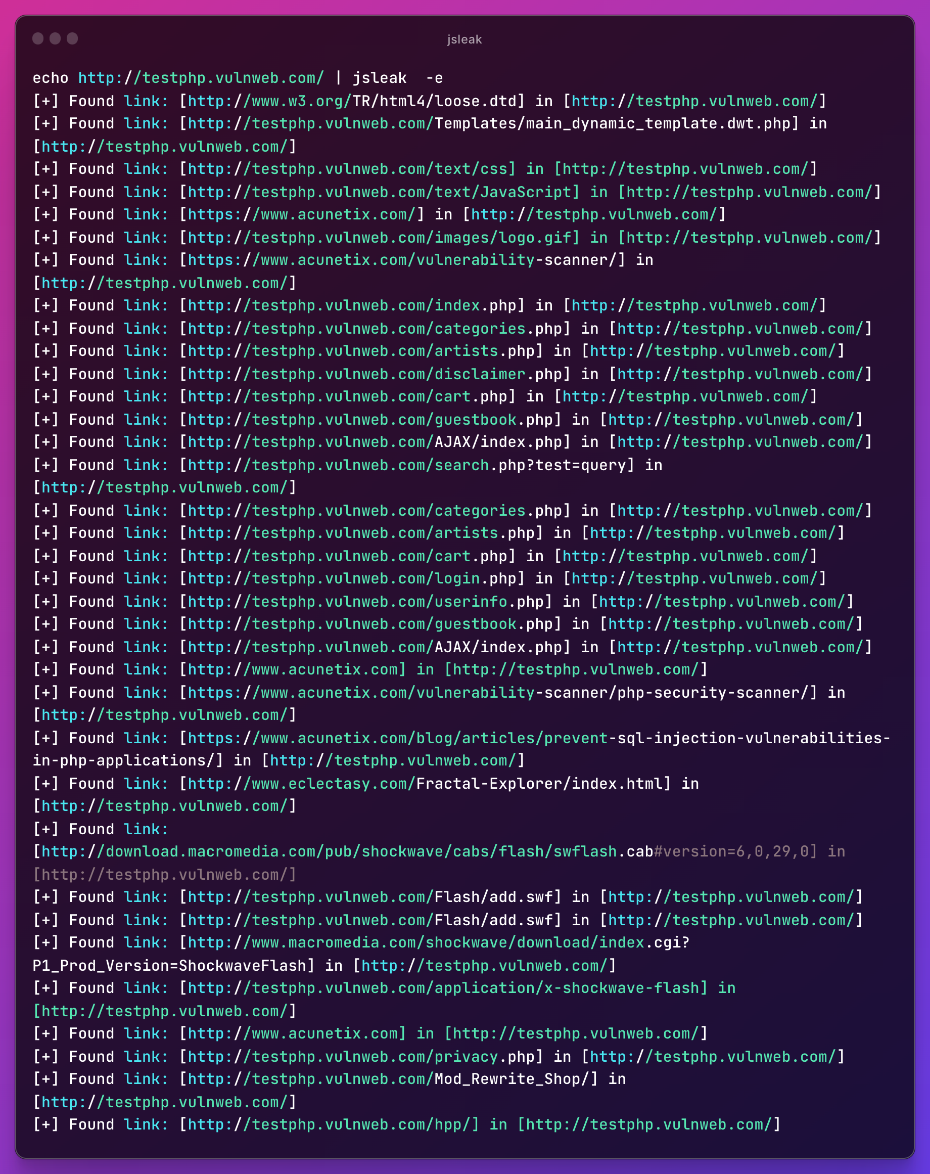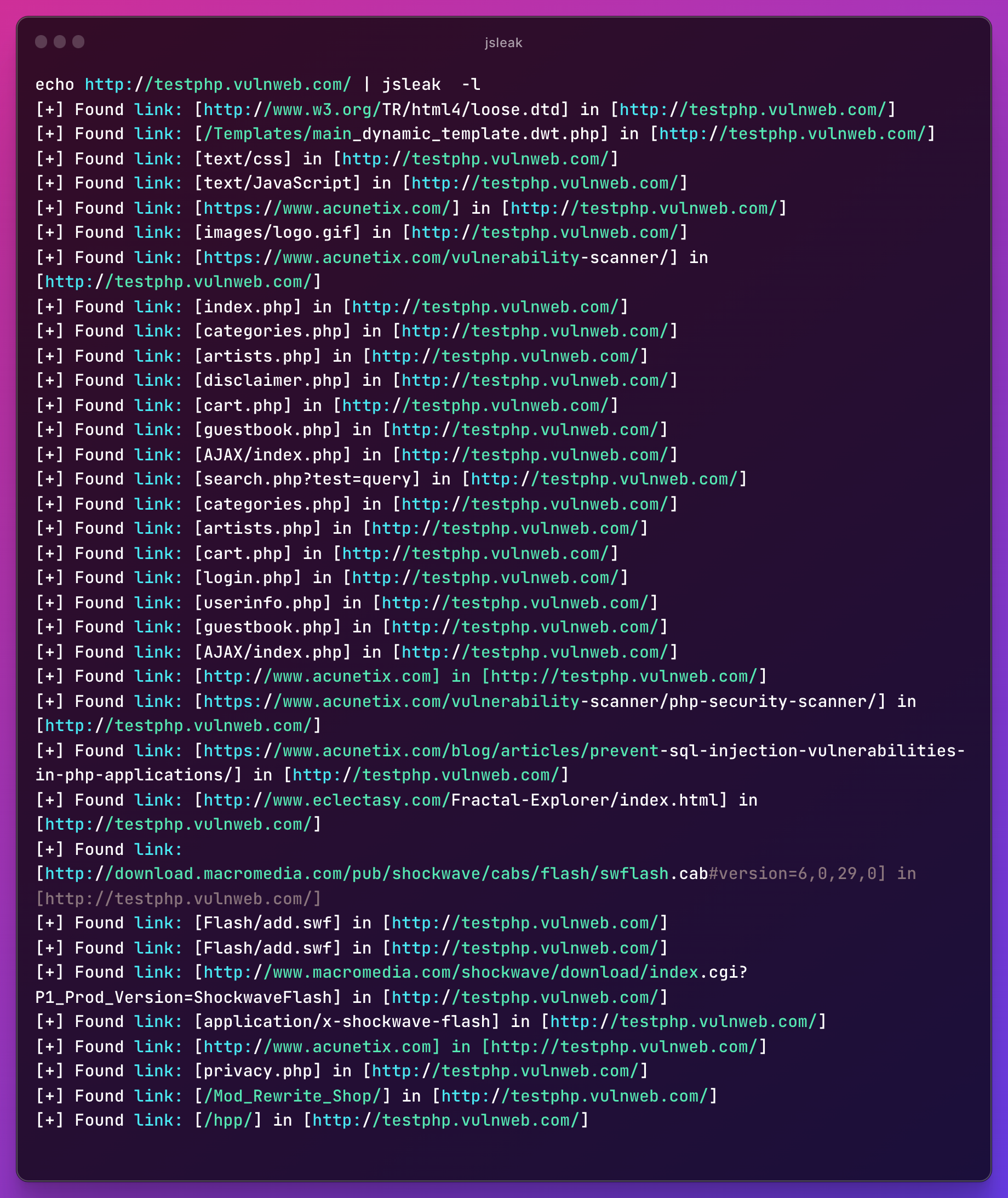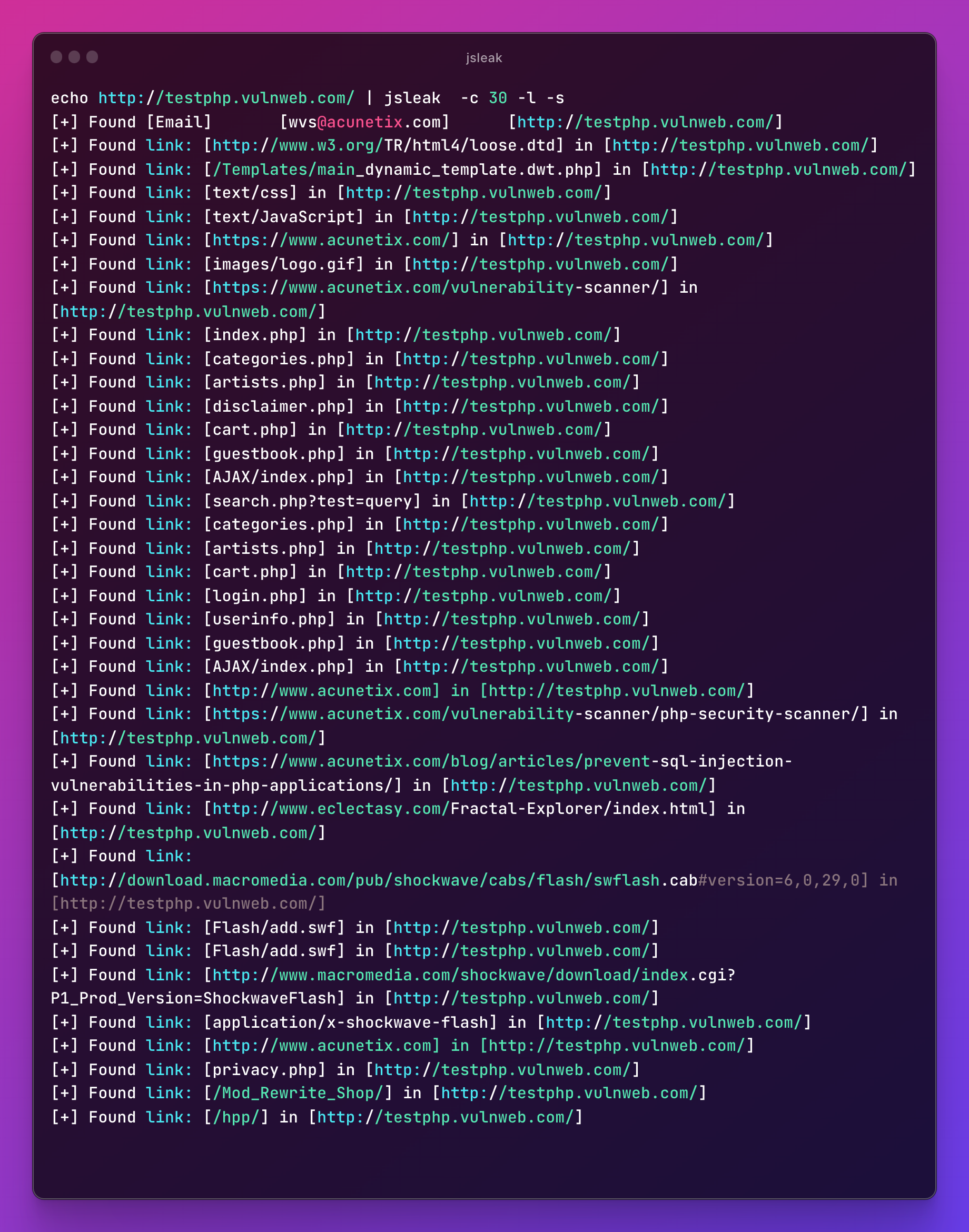 echo http://testphp.vulnweb.com/ | jsleak -l