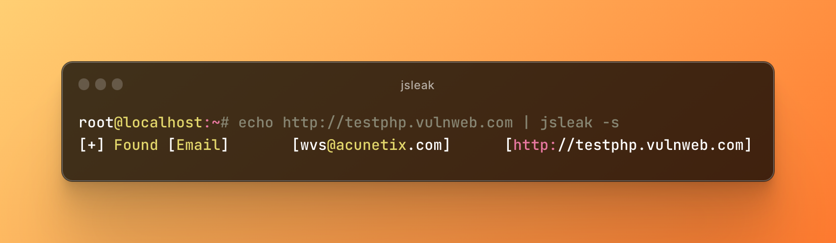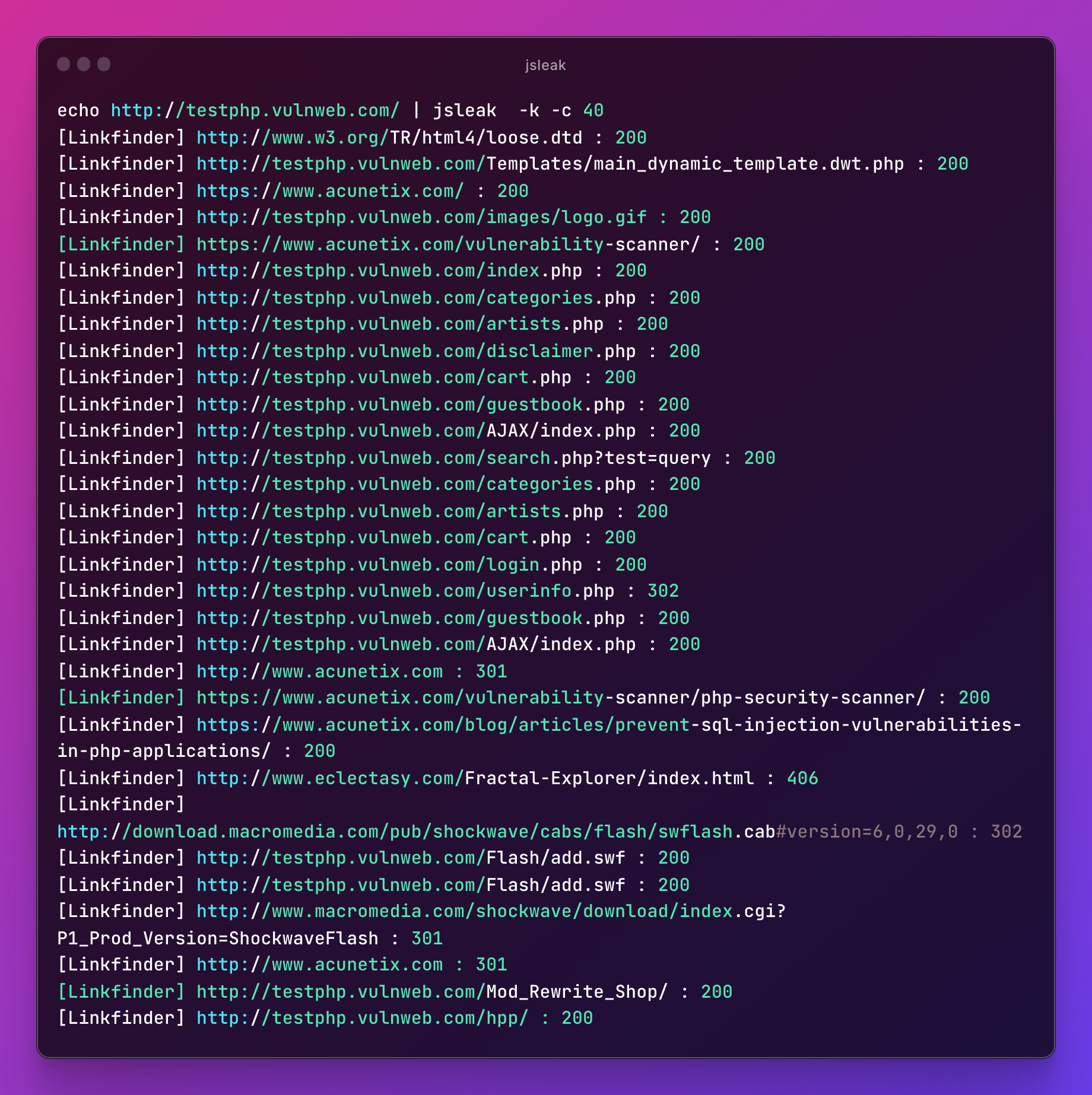 echo http://testphp.vulnweb.com/ | jsleak -e