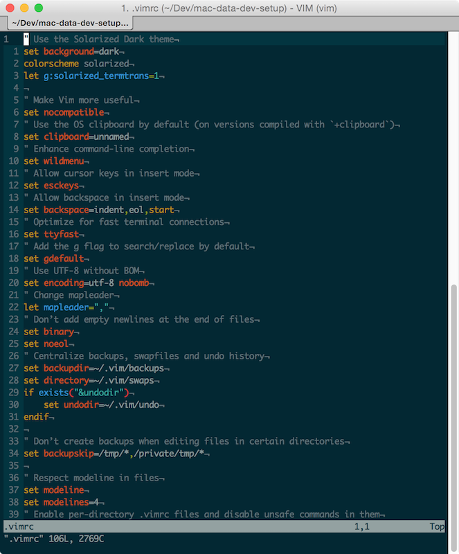 The bootstrap.sh script will sync the dev-setup repo to your local home directory. This will include customizations for Vim, bash, curl, git, tab completion, aliases, a number of utility functions, etc. Section 2 of this repo describes some of the customizations.