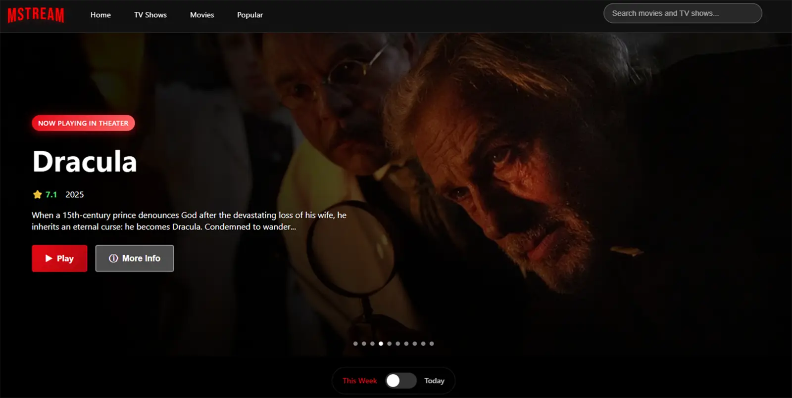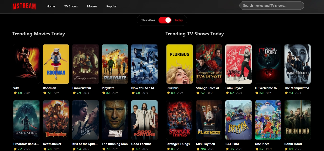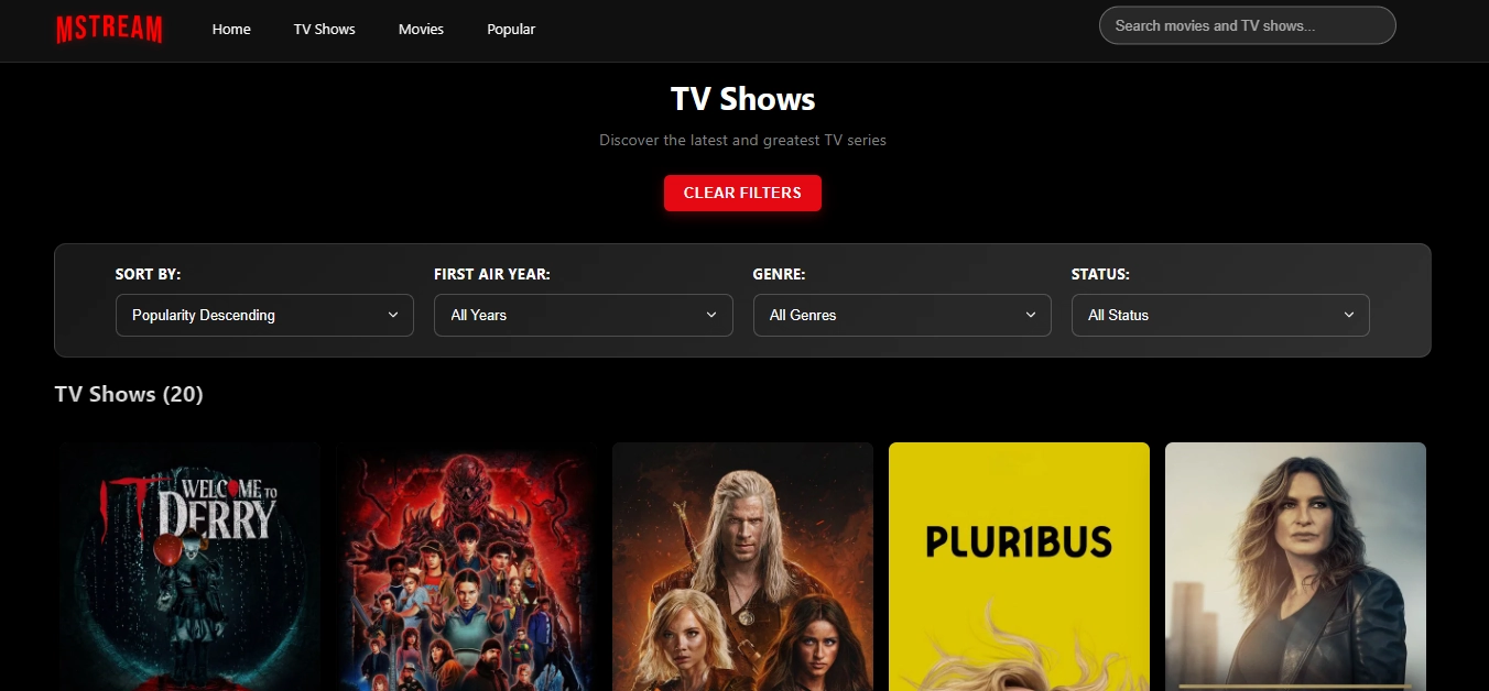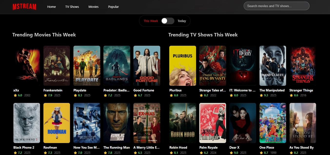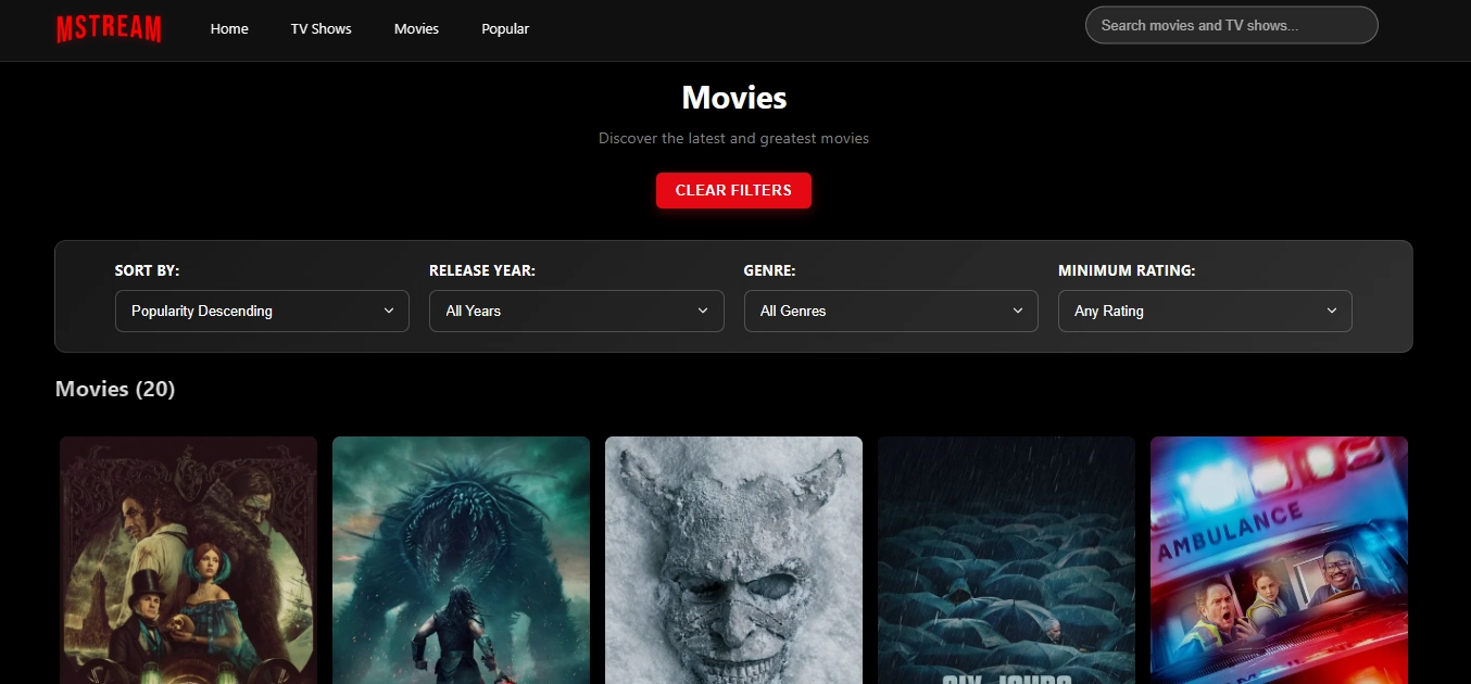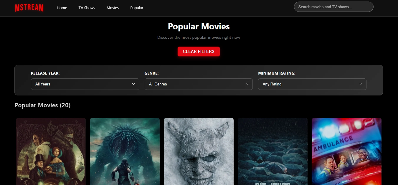 MSTREAM is an open-source movies and tv shows streaming service that uses TheMovieDatabase API, built using ReactJS and CSS, and can be deployed in Cloudflare (as Pages). It lets you easily find any movie with intuitive search, and suggestion feature. Note that the website itself does not have ads anymore, but video source (iframe-based) has embeded ads---please use ad-blocking extension or use Brave browsers.