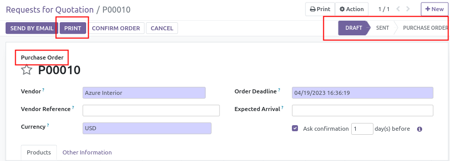 - The states names of the purchase order is altered. 'RFQ' is replaced by 'Draft' and 'RFQ sent' by 'Sent'.