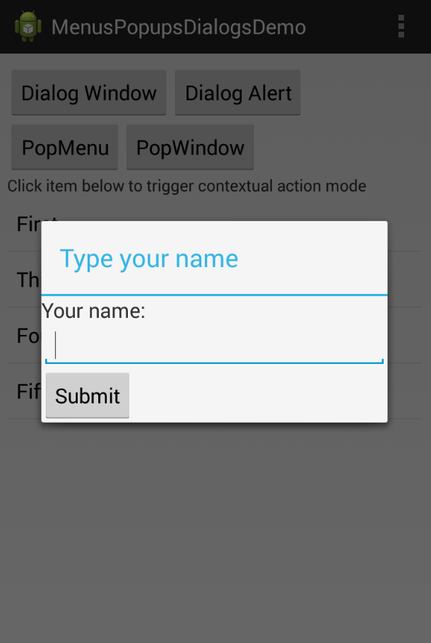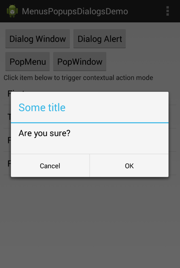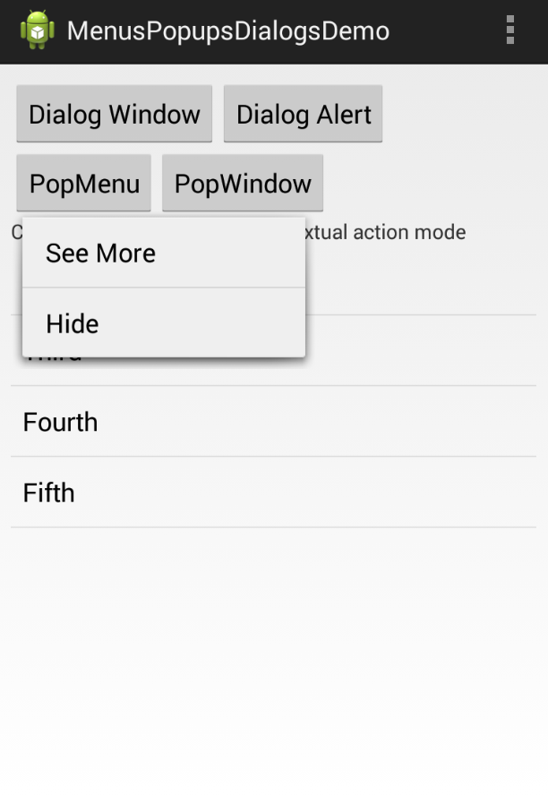 Android demo of menus, popups and dialogs. See the Menus and Popups cliffnotes for more details.