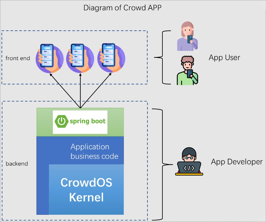 The goal of CrowdOS is to improve the construction efficiency of MCS applications and reduce the usage rights of MCS applications. Currently, CrowdOS uses Web frameworks such as CrowdOS Kernel and SpringBoot to quickly develop crowd intelligence APPs based on crowd intelligence collection functions. The framework diagram of a crowd intelligence APP developed using CrowdOS Kernel is as follows: