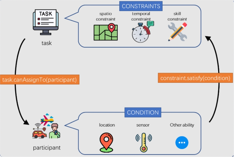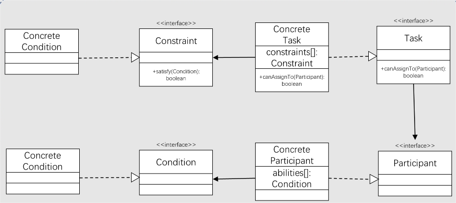 The necessary and sufficient conditions for whether a task can be assigned to a participant are: all constraints of the task must be satisfied by the participant's ability (in current terminology, the participant's ability) ) has the same meaning as the condition to satisfy the constraint). In the specific implementation, the method canAssignTo() will do two checks: