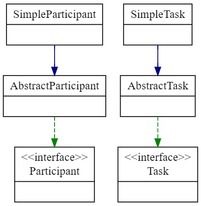 In addition to the key Task and Participant interfaces, the resource package also provides corresponding Abstract Classes, namely AbstractTask and AbstractParticipant. When programmers develop custom tasks and participants, they only need to inherit the corresponding abstract base class instead of starting from implementing the basic interface (same design idea as the design idea of the JAVA Container part). Some example entity classes are also provided.