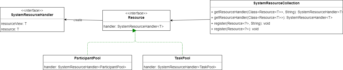 SystemResourceCollection in the system package manages all entities in the system. Currently, system entities include TaskPool, ParticipantPool, AlgoContainer and Schedule. System entities need to inherit the Resource interface and implement the getHandler() method. For the protection of system entities, all operations accessing system entities should go through the getHandler() method, which returns the processing handle of a specific entity. When other packages access system entities, they must pass the entity handle. System entity handle SystemResourceHandler provides two types of access methods: