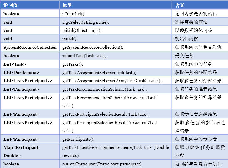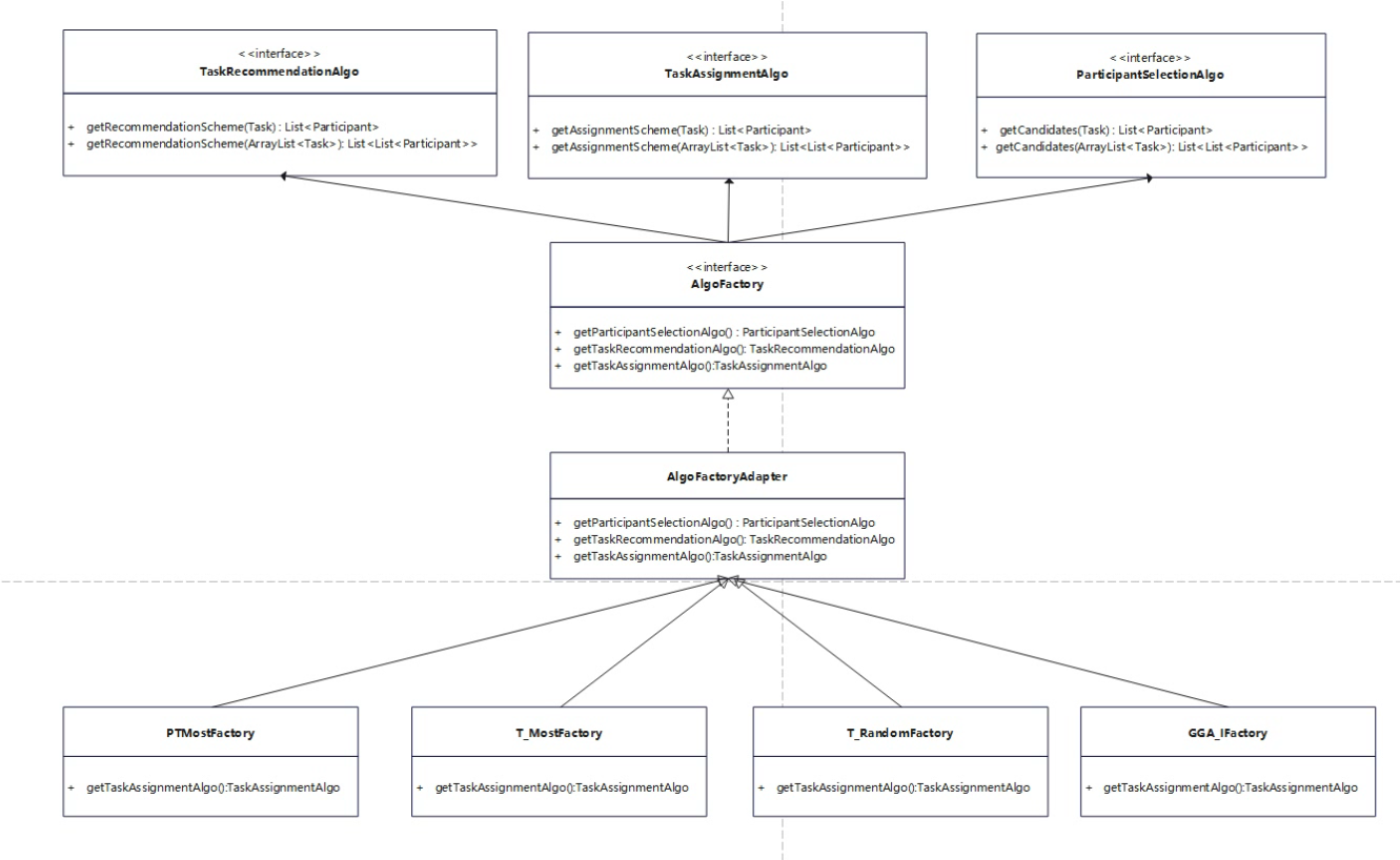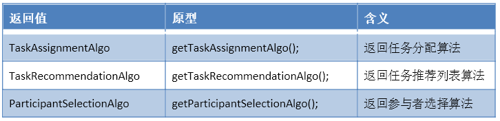 • The algorithms themselves use engineering mode. Each type of algorithm factory produces a specific type of algorithm implementation. Currently, each algorithm factory needs to implement task allocation, task recommendation and participant selection algorithms separately;