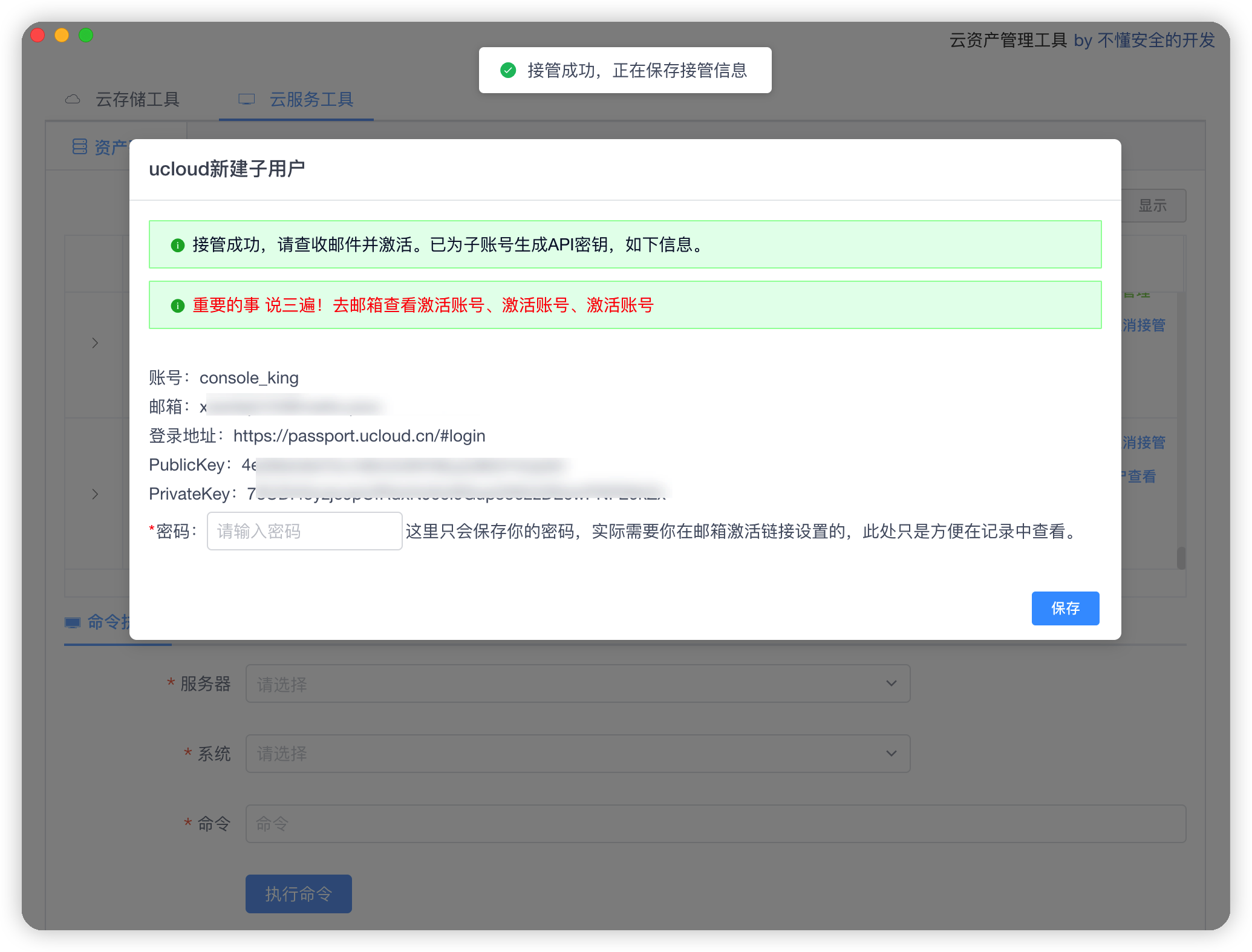 目前工具定位是云安全相关工具,目前是两个模块 云存储工具、云服务工具, 云存储工具主要是针对oss存储、查看、删除、上传、下载、预览等等 云服务工具主要是针对rds、ecs服务器的接管、管理,查看、执行命令等等