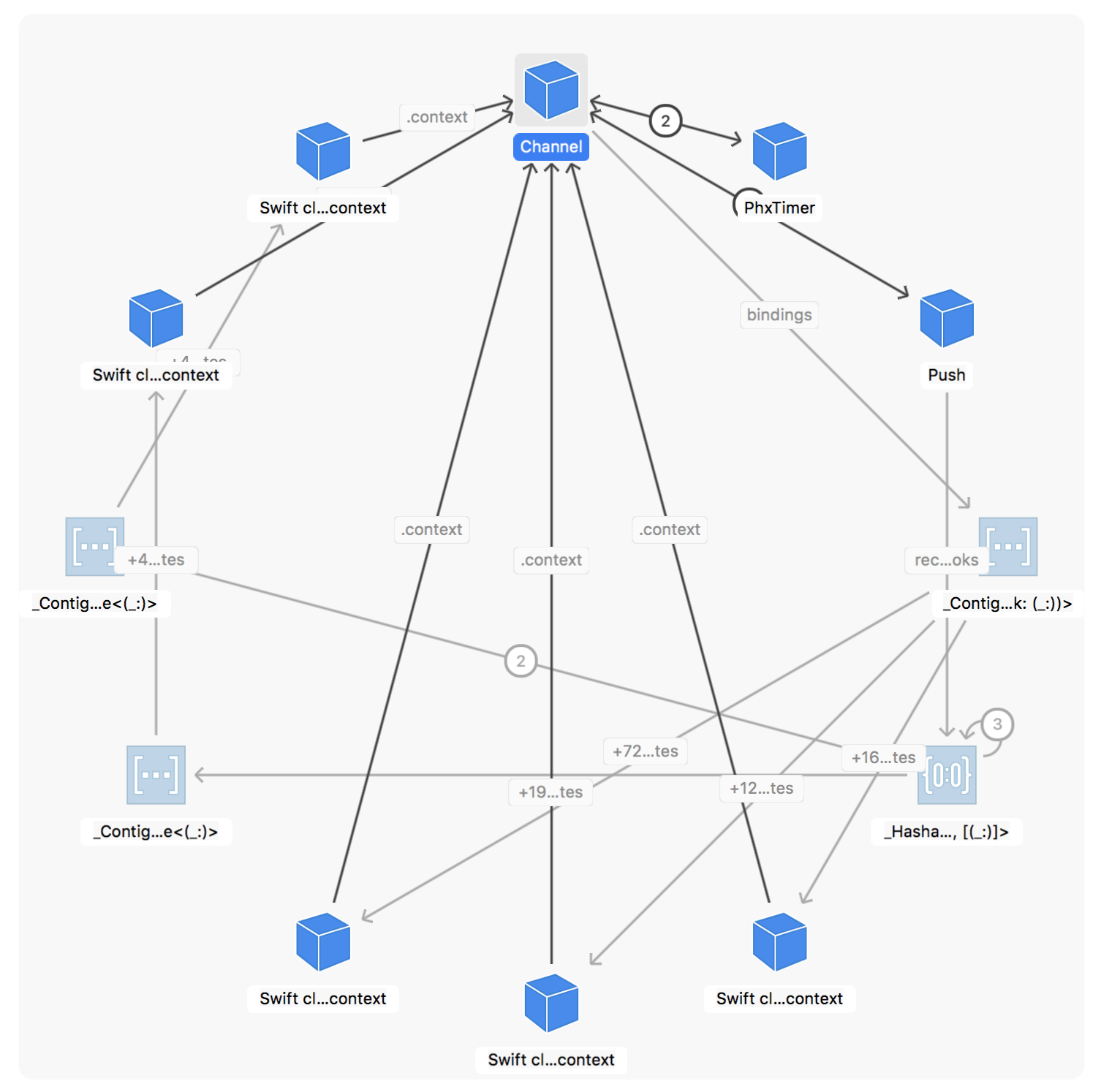 During some profiling tests I noticed some leaked objects, that appeared to be generated following calls to channel.leave(). Originally I assumed it was my code but in the end I managed to find the following in the memory debugger which seems to indicate an orphaned channel, several closure contexts, and cyclic references to PhxTimer and Push. Essentially the channel is never deallocated and however many channels the application joins they always persist in memory.