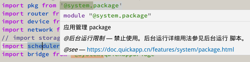 快应用接口定义文档转的 d.ts 定义包,在使用的时候编辑器就可以得到各种提示(类型,example,版本信息等)