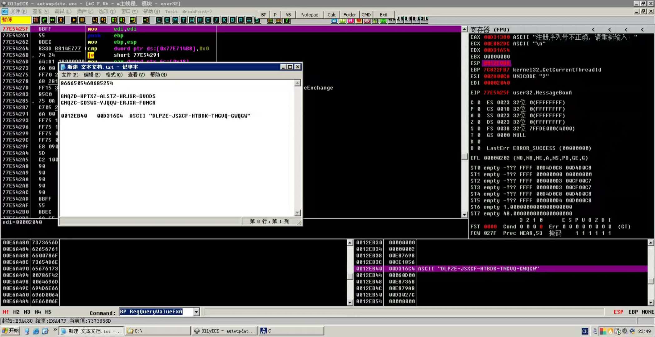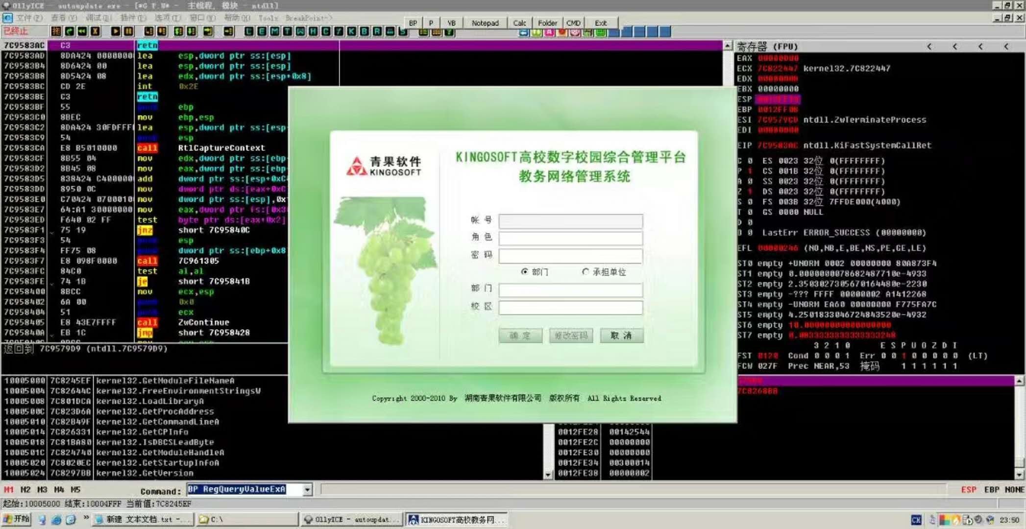 在安装服务端数据库, 应用服务器等需要另外一个密匙, 通过Ollydbg下断点, 然后就是漫长的按下一步, 等那个密匙字符串显示出来, 看了52破解一个入门教程就开干了, 找到密匙的时候心疼学校花了100+w(听说)买这个教务系统