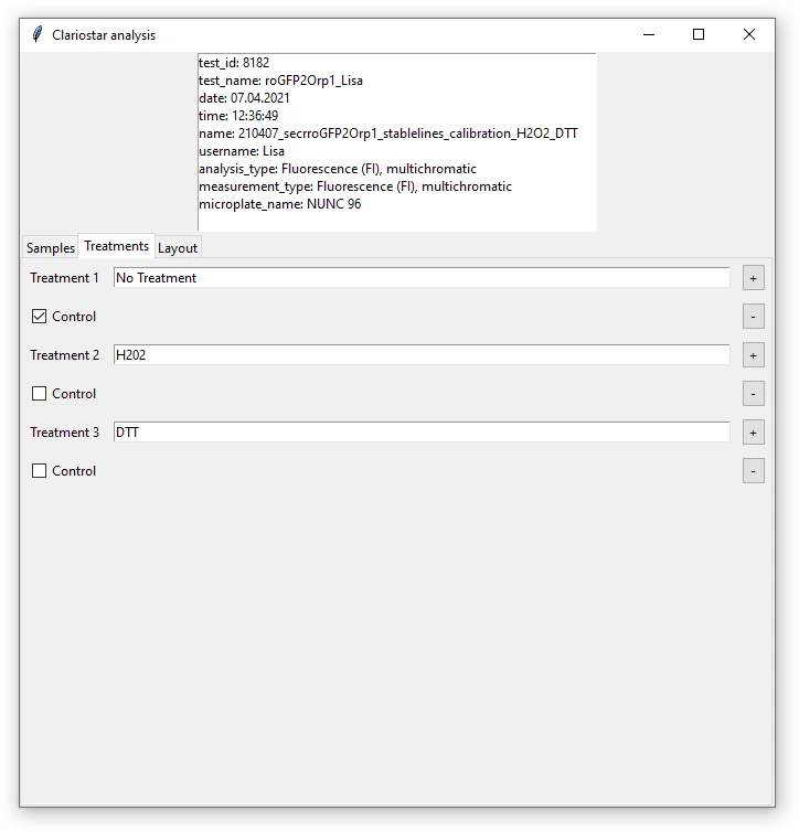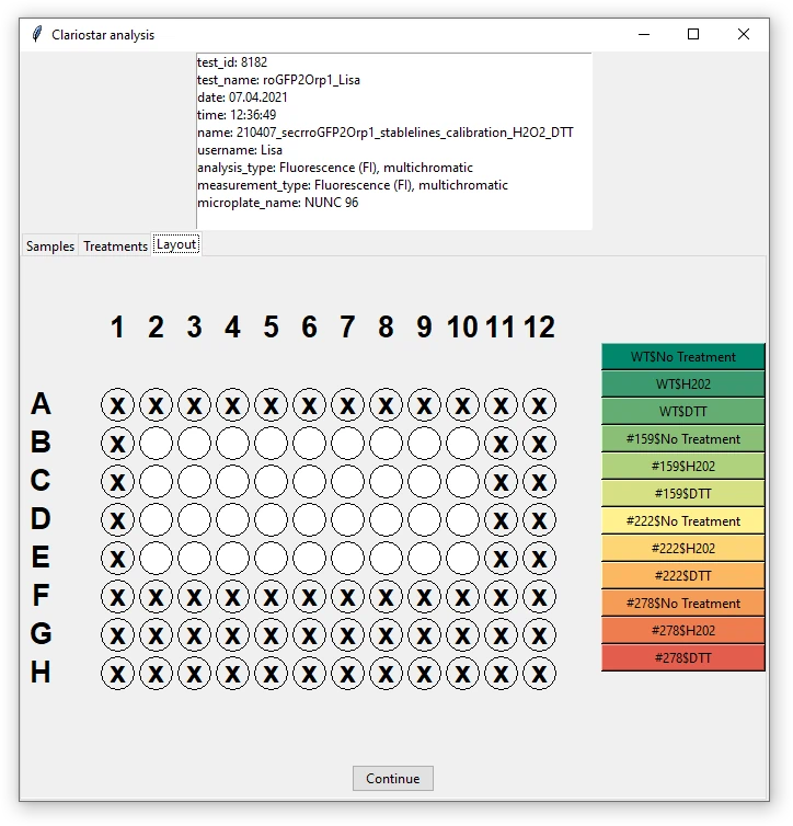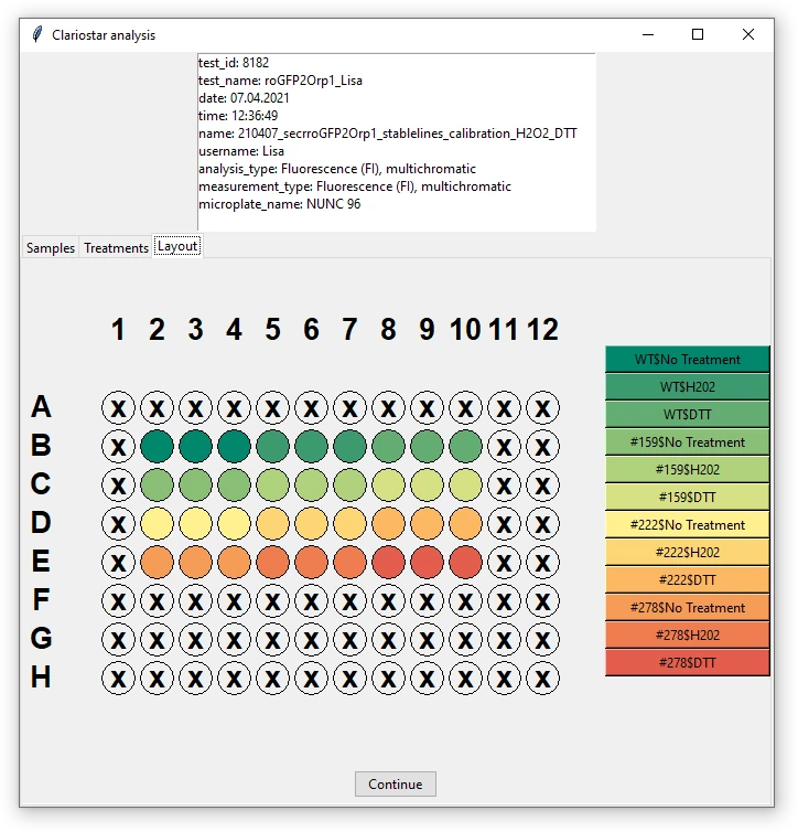 This application aims to make it easier to analyze the data generated by the CLARIOstar® Plus microplate reader by enabling users to easily configure different treatments and repetitions of samples analyzed by the microplate reader. Currently it supports working with the data generated when using Thermo Scientific™ Nunc™ 96-DeepWell™ Polystyrene Plates and the following Analysis settings: