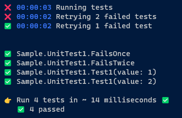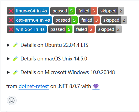 Runs dotnet test with retries for failed tests automatically, and pretty-prints aggregated test results, integrating also with GitHub PR comments just like dotnet-trx.