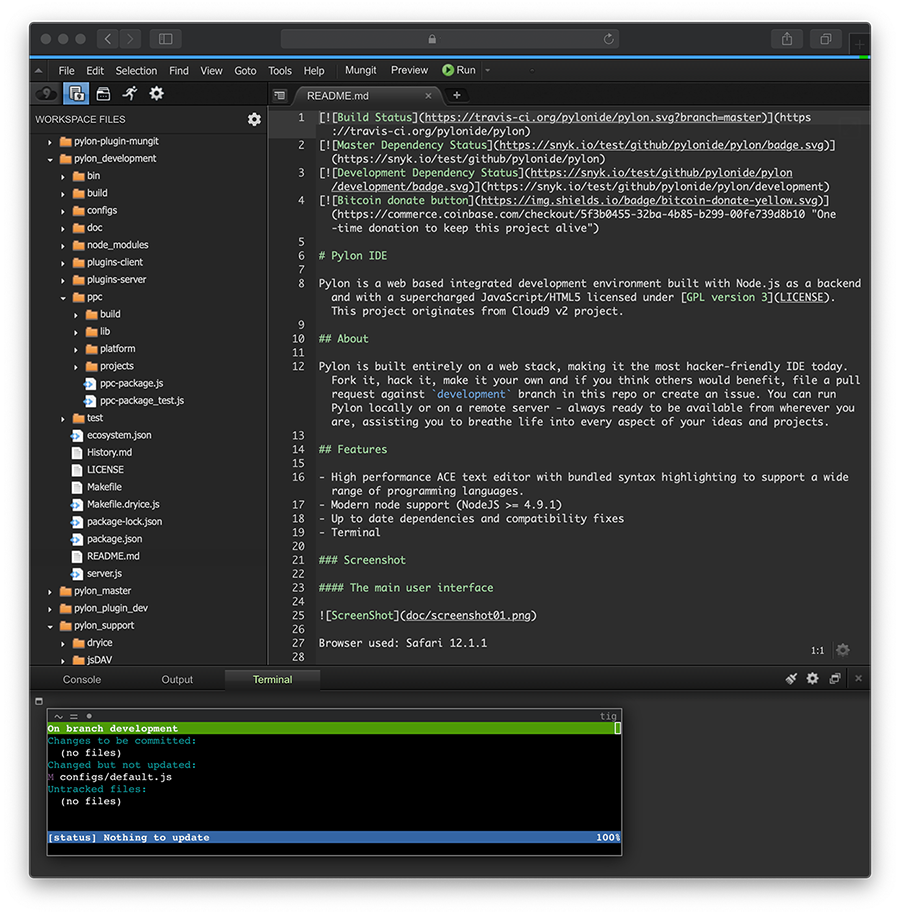 - Cloud9 container Cloud9 Cloud9 is a complete web based IDE with terminal access. This container is for running their core SDK locally and developing plugins. Development